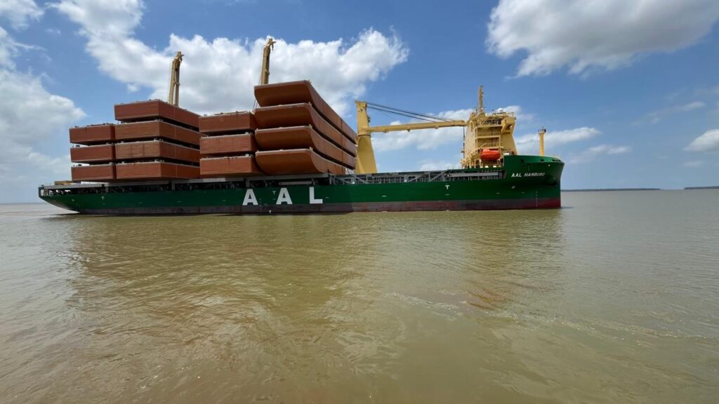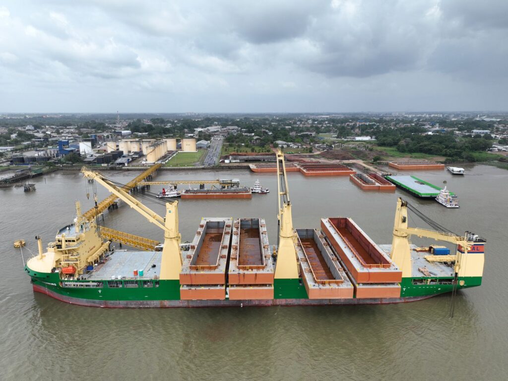 Em outubro, o Terminal de Uso Privado (TUP) da Atem em Belém (PA) sediou uma operação inédita na história da navegação sul-americana: o embarque de 16 barcaças empilhadas transversalmente a bordo do navio de carga pesada AAL Hamburg. A manobra marcou o início do transporte de embarcações destinadas à Hidrovia Paraguai–Paraná, que integrarão a frota fluvial da LHG Logística.